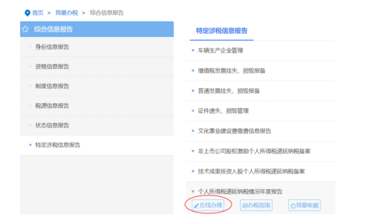 我要辦稅→綜合信息報告→特定涉稅信息報告→個人所得稅遞延納稅情況年度報告