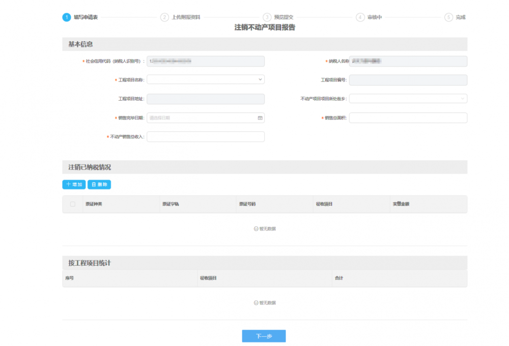 按實(shí)際情況填寫申請表。申請表填寫完成后點(diǎn)擊【下一步】進(jìn)入下一個(gè)環(huán)節(jié)。