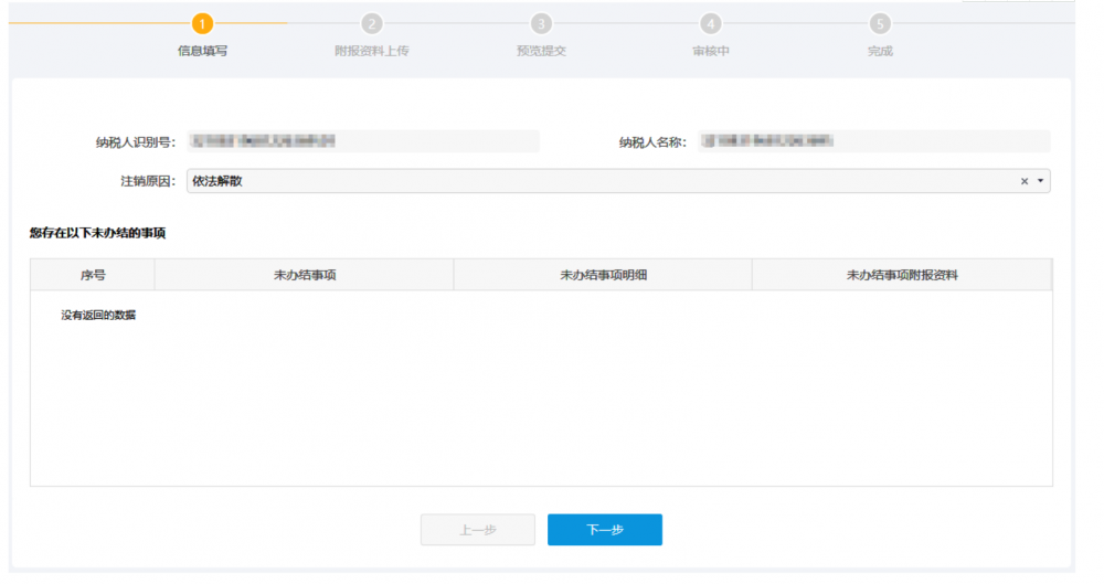當(dāng)您沒有未辦結(jié)事項(xiàng)時(shí),系統(tǒng)將提示“沒有數(shù)據(jù)”。此時(shí),請直接點(diǎn)擊【下一步】按鈕進(jìn)入預(yù)覽步驟。