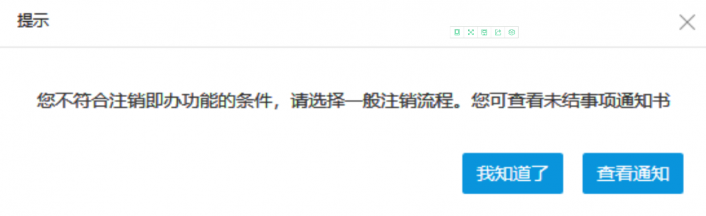 在此步驟,系統(tǒng)會校驗(yàn)?zāi)欠駶M足“即辦注銷流程”的辦理?xiàng)l件??赡艽嬖谝韵虑闆r: