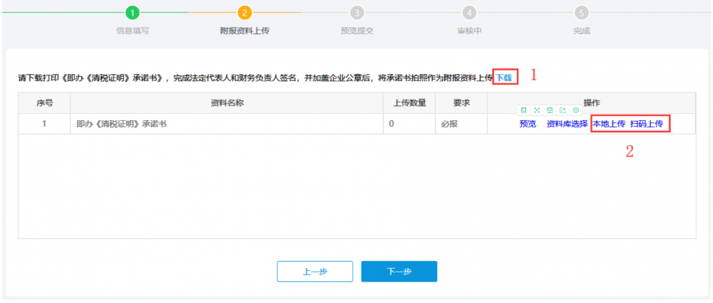 3、通過圖中“2”處的【本地上傳】或者【掃碼上傳】的方式,將簽字蓋章后的《即辦《清稅證明》承諾書》拍照作為附報(bào)資料上傳。