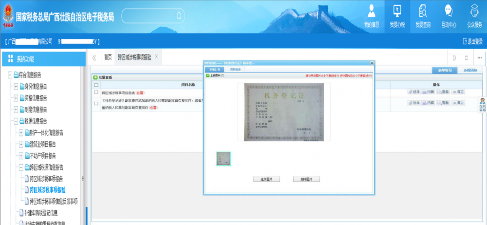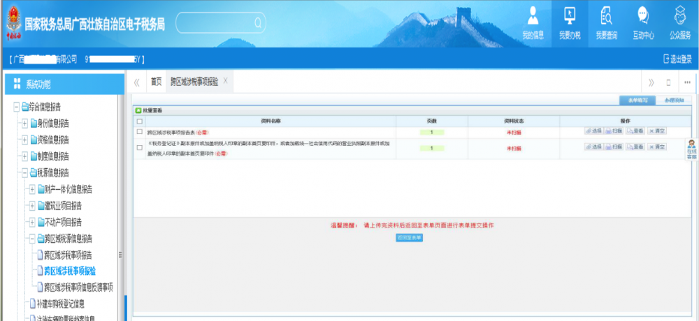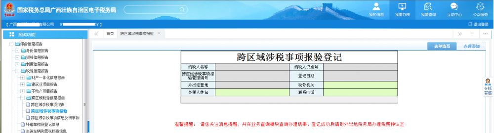 (一)登錄廣西電子稅務(wù)局填寫(xiě)《跨區(qū)域涉稅事項(xiàng)報(bào)驗(yàn)登記》