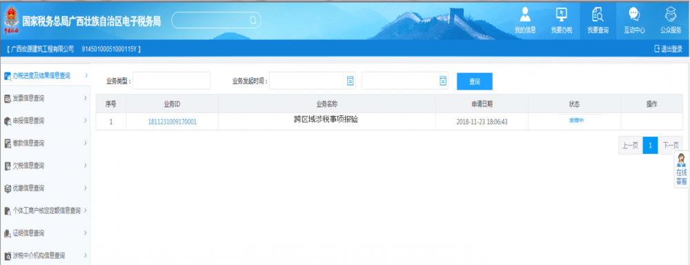 業(yè)務(wù)提交后,可通過(guò)右上角【我要查詢—辦稅進(jìn)度及結(jié)果信息查詢】,查看該業(yè)務(wù)辦理進(jìn)度及業(yè)務(wù)狀態(tài):