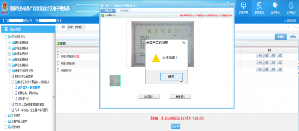 廣西電子稅務(wù)局《稅務(wù)證件遺失、損毀管理》上傳證件