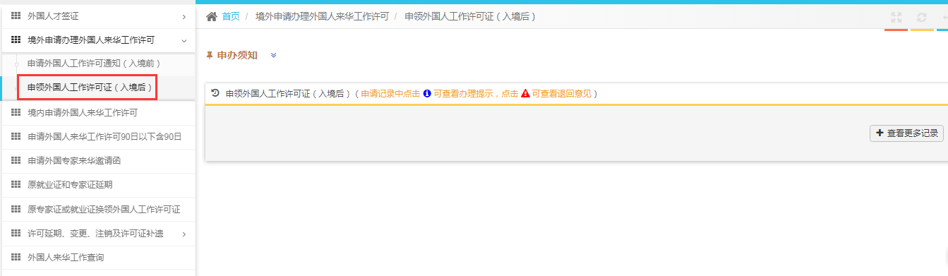 第二類為在2017年11月11日后新提交的許可通知申請,辦理工作許可證時需點擊“境外申請辦理外國人來華工作許可”模塊下的“申領(lǐng)外國人工作許可證(入境后)”找到許可通知的申請,補充上傳簽證信息并提交,如下圖。