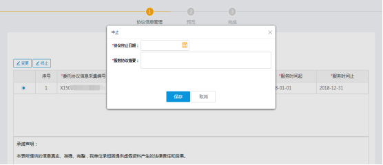 第四步:選擇協(xié)議,點擊“終止”按鈕,打開終止界面。如實填寫相關(guān)信息 ,點擊“保存”按鈕