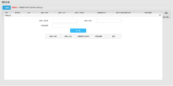 第三步:點擊“新增”按鈕,彈出綁定企業(yè)新增頁面,輸入納稅人識別號、納稅人名稱等查詢條件,點擊“下一步”按鈕,查詢出企業(yè)信息