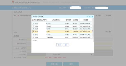 在彈出框中選中需轉(zhuǎn)讓土地信息,點(diǎn)擊彈出框中的“確認(rèn)”,自動(dòng)將該土地的信息帶入到轉(zhuǎn)讓頁面。