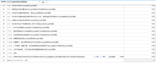 6. 納稅人預(yù)繳方式為“按照實(shí)際利潤(rùn)額預(yù)繳”的一般納稅人,在主附表樹(shù)中打開(kāi)附表《A201030減免所得稅優(yōu)惠明細(xì)表》錄入數(shù)據(jù),點(diǎn)擊確定,數(shù)據(jù)帶入主表第12行。