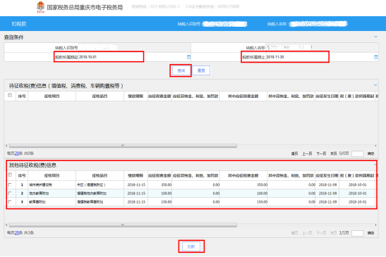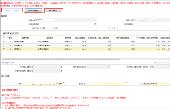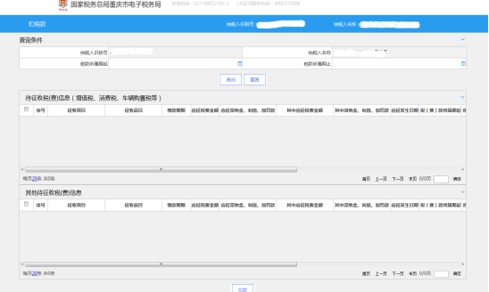 進入扣稅款功能,選擇稅款所屬期查詢出原國地稅已申報未交款欠稅信息,分別顯示在“待征收稅(費)信息”中,納稅人可根據(jù)實際情況勾選需要繳款待繳稅款信息。