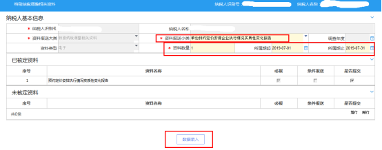 進入特別納稅調(diào)整相關(guān)資料采集界面,選擇資料報送小類“單邊預(yù)約定價安排企業(yè)自行情況年度報告”。選擇資料類型與資料數(shù)量,資料數(shù)量與要提交的資料數(shù)量必須相等。勾選要提交的資料選擇申報所屬期起止時間,確定基本信息之后點擊“數(shù)據(jù)錄入”。