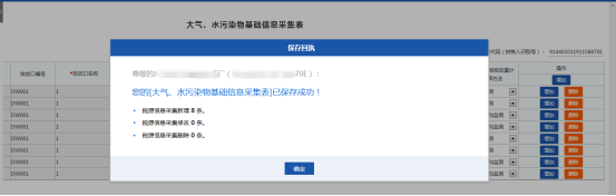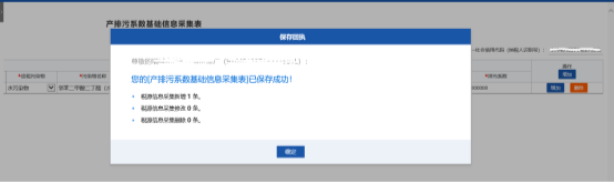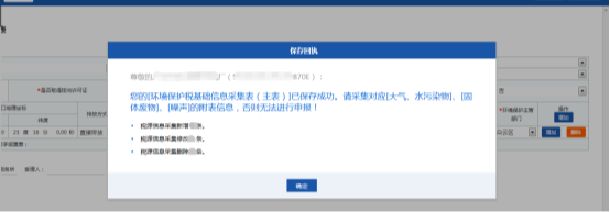 納稅人填寫(xiě)確認(rèn)無(wú)誤后,點(diǎn)擊頁(yè)面右上角【保存】按鈕進(jìn)行提交數(shù)據(jù),系統(tǒng)返回保存回執(zhí),如下圖所示。注意:在主表維護(hù)了大氣或水污染基礎(chǔ)信息的稅源,在附表一至少需要新增一條與其對(duì)應(yīng)的具體排放污染物信息,否則保存不成功。