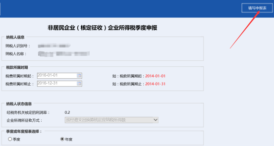 3、進(jìn)入到申報(bào)表填寫(xiě)界面,可以看到在頁(yè)面會(huì)顯示填寫(xiě)申報(bào)信息選擇項(xiàng)。選擇【年度】選擇好只有點(diǎn)擊【填寫(xiě)申報(bào)表】。系統(tǒng)提供了完善的表內(nèi)、表間的自動(dòng)計(jì)算和校驗(yàn)的功能,納稅人只需填寫(xiě)所必須的幾項(xiàng)關(guān)鍵業(yè)務(wù)數(shù)據(jù),即可完成。