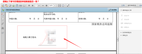6、核對(duì)數(shù)據(jù)無(wú)誤后,若納稅人為CA用戶(hù),則需點(diǎn)擊【納稅人數(shù)字簽名】,進(jìn)行簽名,然后點(diǎn)擊【申報(bào)】,進(jìn)行提交申報(bào)。若納稅人不為CA用戶(hù),則無(wú)需進(jìn)行CA簽名,直接點(diǎn)擊【申報(bào)】,提交申報(bào)表。