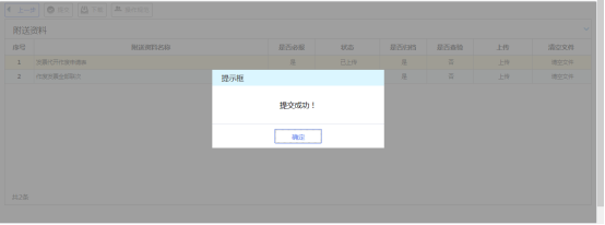 5、 附列資料逐個上傳完畢,點擊 “提交”按鈕,系統(tǒng)將提示提交成功,該申請?zhí)峤坏蕉悇諜C關系統(tǒng)中,申請操作全部完成。