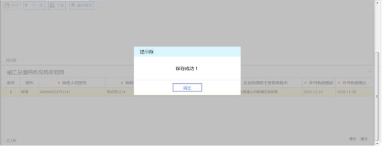 2、 點(diǎn)擊 “增行”即可新增被匯總繳納機(jī)構(gòu)場(chǎng)所,若要對(duì)已批準(zhǔn)的被匯總繳納機(jī)構(gòu)場(chǎng)所進(jìn)行延續(xù)或刪除,點(diǎn)擊“操作”,將該納稅人添加入列表進(jìn)行相應(yīng)變更,相關(guān)事項(xiàng)錄入完畢,點(diǎn)擊 “保存”按鈕,提示保存成功后,點(diǎn)擊 “確定”。