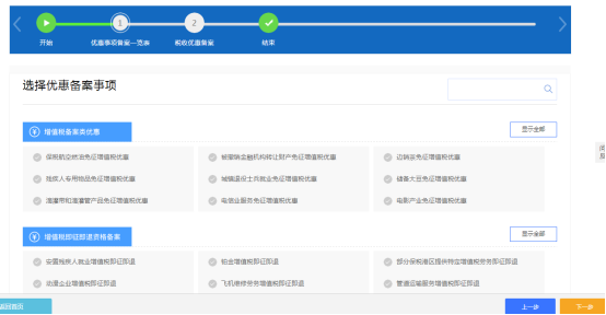 2.檢測(cè)條件均通過(guò)后,點(diǎn)擊“下一步”進(jìn)入優(yōu)惠備案事項(xiàng)選擇界面。通過(guò)右上角的搜索按鈕可以快捷搜索優(yōu)惠備案事項(xiàng)。