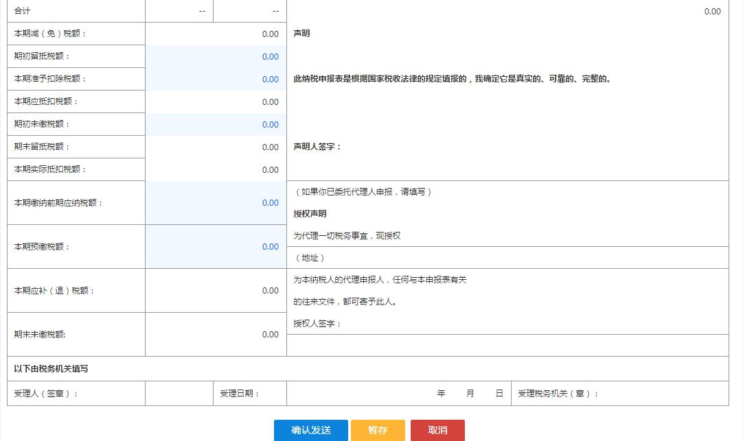 手動(dòng)輸入期初留抵稅額、本期準(zhǔn)予扣除稅額、期初未繳稅額、本期繳納前期應(yīng)納稅額、 本期預(yù)繳稅額,其余字段為自動(dòng)計(jì)算出。