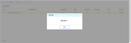 6     附列資料逐個(gè)上傳完畢,點(diǎn)擊【提交】按鈕,系統(tǒng)將提示提交成功,該申請(qǐng)?zhí)峤坏蕉悇?wù)機(jī)關(guān)系統(tǒng)中,申請(qǐng)操作全部完成。