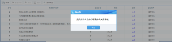 4、     附列資料逐個上傳完畢,點擊【提交】按鈕,系統(tǒng)將提示提交成功,該申請?zhí)峤坏蕉悇?wù)機(jī)關(guān)系統(tǒng)中,申請操作全部完成。