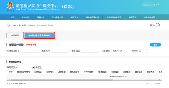 在“出口轉(zhuǎn)內(nèi)銷發(fā)票查詢”下,可對“未到勾選日期發(fā)票查詢”,并且輸入相應(yīng)查詢條件(發(fā)票代碼、發(fā)票號碼、開票日期),可查詢發(fā)票明細(xì):