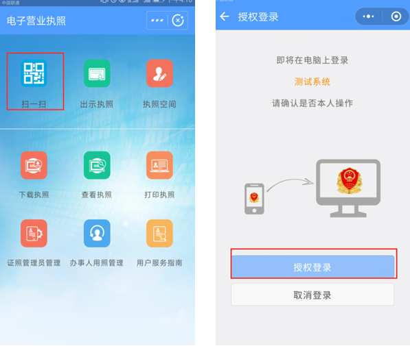 3)打開支付寶或微信電子營業(yè)執(zhí)照小程序,點擊“掃一掃”,出現(xiàn)營業(yè)執(zhí)照列表,點擊需要登錄的企業(yè)信息,授權(quán)登錄。