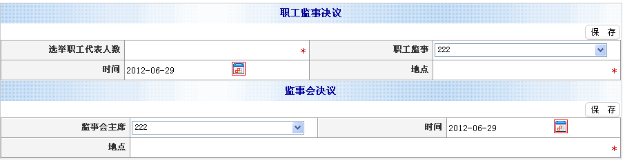 2、股東會(huì)議決議,如下圖所示: 錄入“股東會(huì)議召開周期(月)”等必填項(xiàng),通過下拉框選擇“二、選舉董事會(huì)成員信息”“三、是否設(shè)監(jiān)事會(huì)”后,保存即可。 股東會(huì)議召開周期