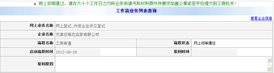 企業(yè)初審?fù)ㄟ^后,需在六十個(gè)工作日之內(nèi)將業(yè)務(wù)申請(qǐng)書和材料原件按要求加蓋公章或簽字后提交到工商機(jī)關(guān)。如下圖所示: