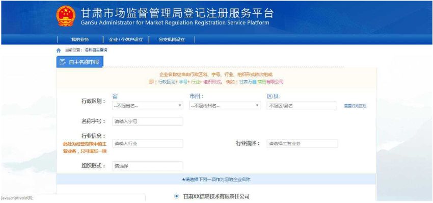 一、當(dāng)前經(jīng)辦人已完成實名認(rèn)證的情況下,進(jìn)入甘肅省市場監(jiān)督管理局登記注冊服務(wù)平臺,選擇頭部列表“企業(yè)/個體戶設(shè)立”,進(jìn)入自主名稱選擇頁面