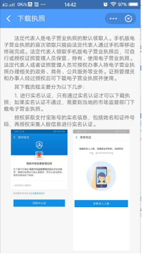 如果這里邊沒有需要的電子營業(yè)執(zhí)照,則點(diǎn)擊左上角“<”,返回上一頁,先下載營業(yè)執(zhí)照。如果不會操作,請參考官方“使用幫助=》操作指南=》下載執(zhí)照=》”如下圖: