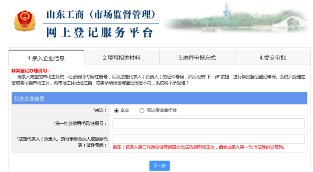 需要做備案登記業(yè)務(wù)的企業(yè)或農(nóng)民專業(yè)合作社點(diǎn)擊備案登記操作如下圖3-1進(jìn)入備案填寫頁面如圖3-2所示。選中企業(yè)類別,以企業(yè)為例輸入統(tǒng)一社會(huì)信用代碼或注冊(cè)號(hào)、法定代表人證件號(hào)碼等信息點(diǎn)擊下一步按鈕。