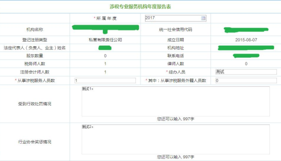 1.進入方式:點擊我要辦稅-涉稅專業(yè)服務機構管理-其他涉稅專業(yè)服務機構管理-涉稅專業(yè)服務機構年度報告,進入下圖,進行信息填寫;