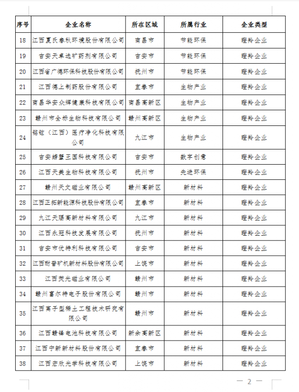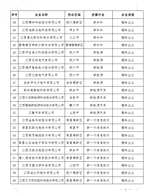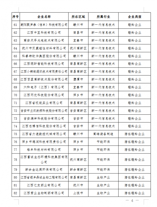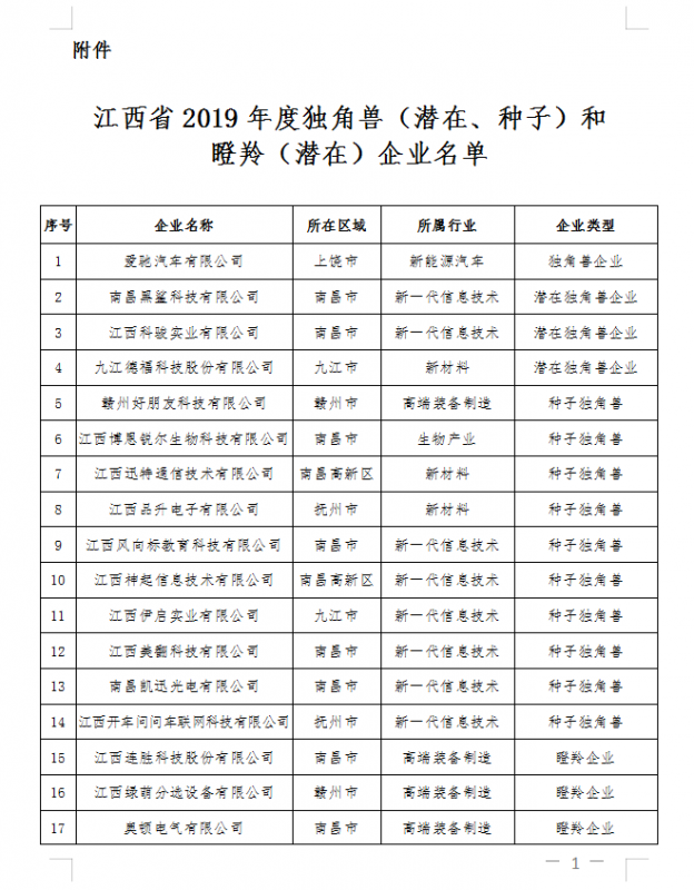 為貫徹落實省委、省政府推進創(chuàng)新型省份建設關于“科技型企業(yè)梯次培育行動”要求,省推進創(chuàng)新型省份建設領導小組辦公室組織開展了江西省2019年度獨角獸(潛在、種子)和瞪羚(潛在)企業(yè)申報評選工作。經(jīng)企業(yè)填報、推薦部門初審推薦、第三方機構(gòu)評審、征求省推進創(chuàng)新型省份領導小組各成員單位意見等程序,評選出江西省2019年度獨角獸企業(yè)1家、潛在獨角獸企業(yè)3家、種子獨角獸企業(yè)10家、瞪羚企業(yè)60家、潛在瞪羚企業(yè)40家。