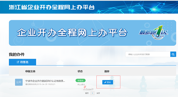 使用"浙江政務(wù)服務(wù)網(wǎng)"實(shí)名認(rèn)證賬號(hào),登入浙江省企業(yè)登記全程電子化登記平臺(tái),點(diǎn)擊【待簽名】--【簽名】。