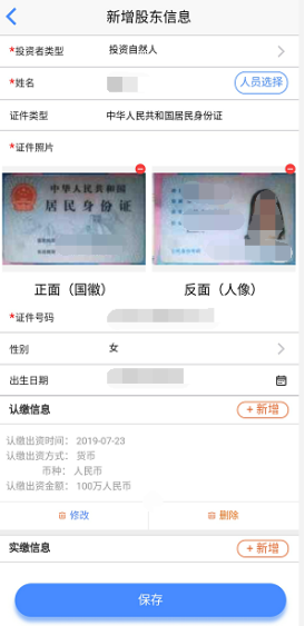 出資信息,包括股東類型、姓名、證件及認(rèn)繳信息等。填寫完成后點擊“保存”,如下圖: