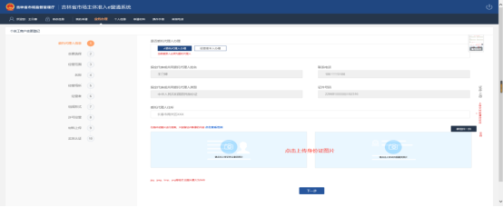 - 如若登錄系統(tǒng)的是經營者本人,此處直接點擊下一步即可,如果登錄系統(tǒng)辦理業(yè)務的不是經營者本人,需要選擇委托代理人辦理,然后填寫完整的信息,上傳委托人的身份證正反面照片后,即可點擊下一步繼續(xù)辦理。如下圖: