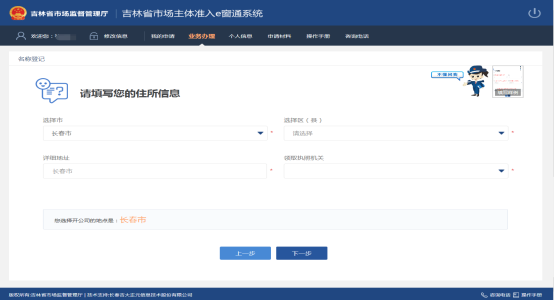 15) 下拉選擇“市”,選擇“區(qū)/縣”,輸入“詳細(xì)地址”,選擇“領(lǐng)取執(zhí)照機(jī)關(guān)”,如下圖。