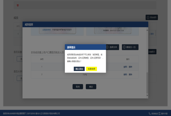 22) 一個(gè)成員添加成功,此法同樣添加其它4位成員信息并提交成功,點(diǎn)擊【確認(rèn)添加】按鈕,如下圖