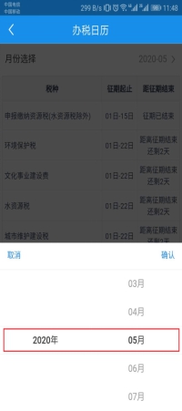 如需要查詢本年其他月份的辦稅日歷,可以按照圖2,進行選擇。選擇需要查詢月份,點擊【確認】即可。