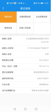 查詢登錄企業(yè)的納稅人稅務登記,顯示基本信息、注冊信息、企業(yè)經(jīng)營信息、辦稅人員信息等。