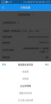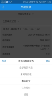 第四步,打開頁面,默認帶出是本屬期內(nèi)的全部欠稅信息,用戶也可以修改查詢條件,進行查詢。點擊 “全部征收項目”可選擇要查詢的征收項目;點擊“全部稅款狀態(tài)”可選擇查詢稅款狀態(tài)。