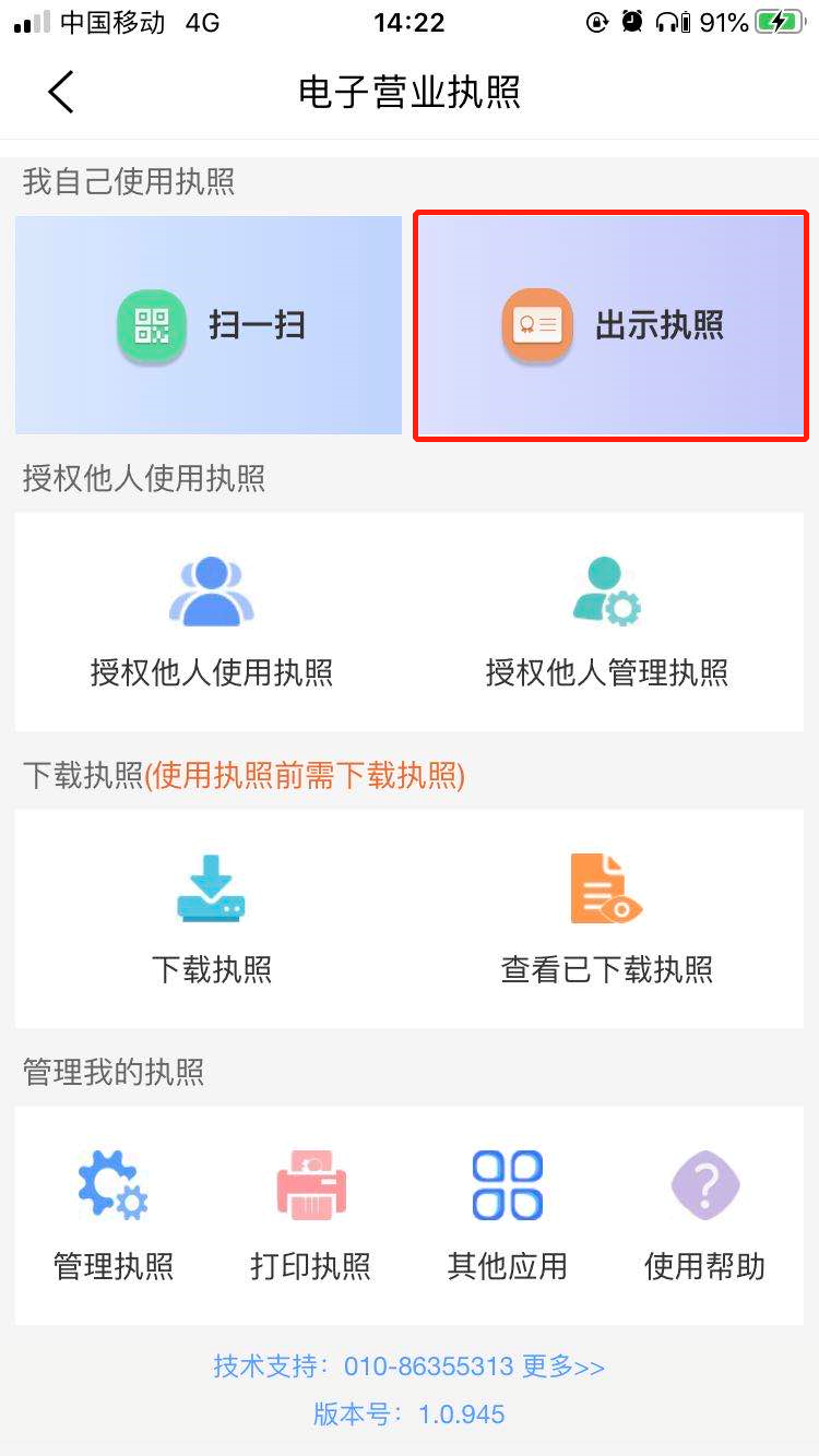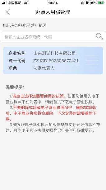持照人點(diǎn)擊“出示執(zhí)照”,選擇要出示的電子營業(yè)執(zhí)照,輸入執(zhí)照密碼并驗(yàn)證通過后即可展示其合法持有的電子營業(yè)執(zhí)照。