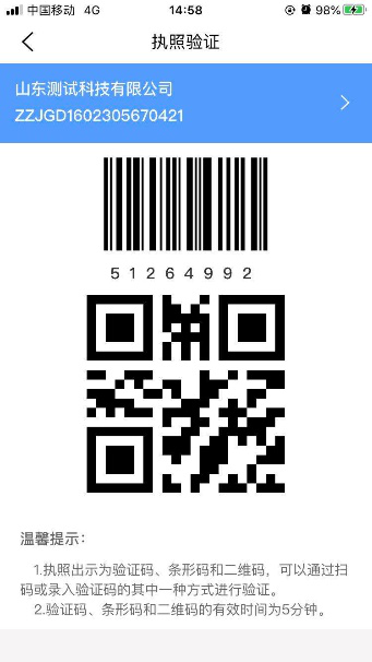 1.掃碼企業(yè)出示的電子營業(yè)執(zhí)照條形碼、二維碼。