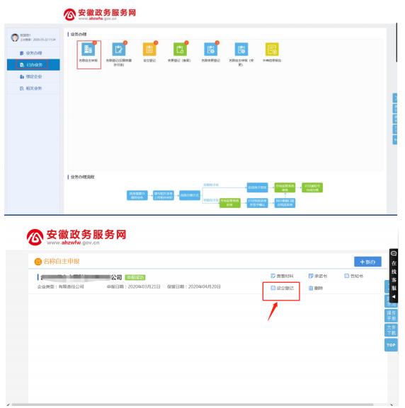 1設(shè)立登記請在名稱已核準后進行,如果是名稱自主申報,在通過后可以直接點擊名稱自主申報頁面里的設(shè)立登記按鈕進入設(shè)立程序。