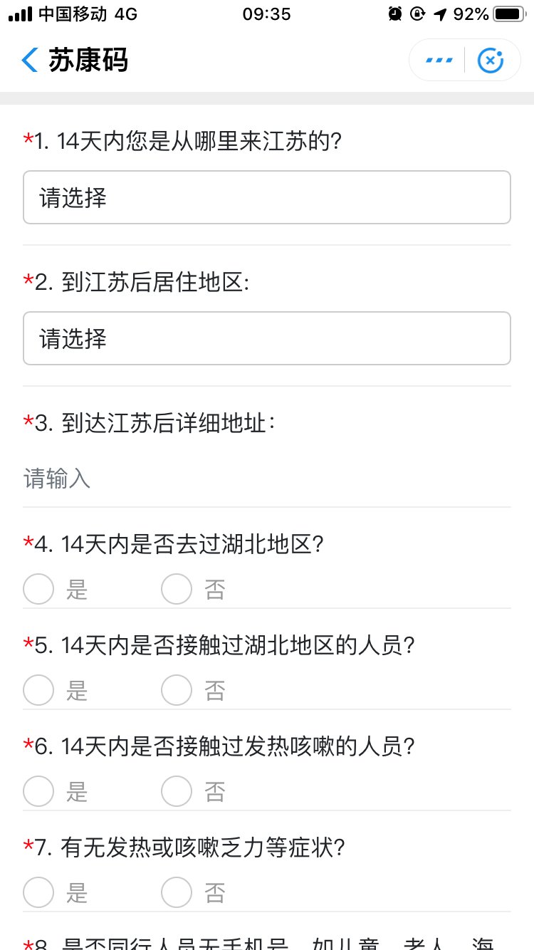 12. 用戶從國外到上海,上海到南京,南京到省內(nèi)其他城市蘇康碼途徑地如何填寫?是否每到一地都需重新申報?