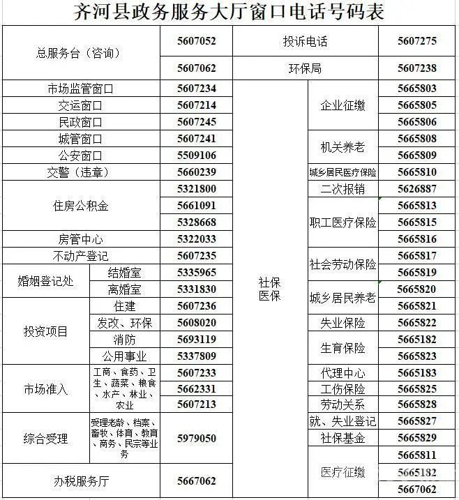超全:齊河縣政務(wù)服務(wù)中心辦事大廳入駐單位窗口咨詢電話匯總