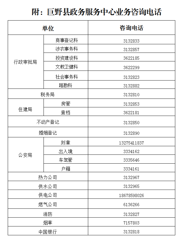 超全:巨野縣政務(wù)服務(wù)中心辦事大廳入駐單位窗口咨詢電話匯總