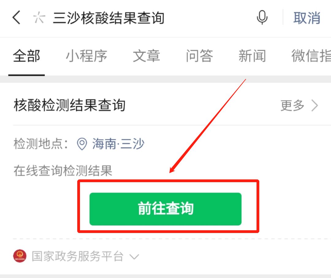 1.使用微信搜索“三沙核酸結(jié)果查詢”,隨后點(diǎn)擊核酸檢測結(jié)果查詢服務(wù)中的“前往查詢”(如下圖所示);
