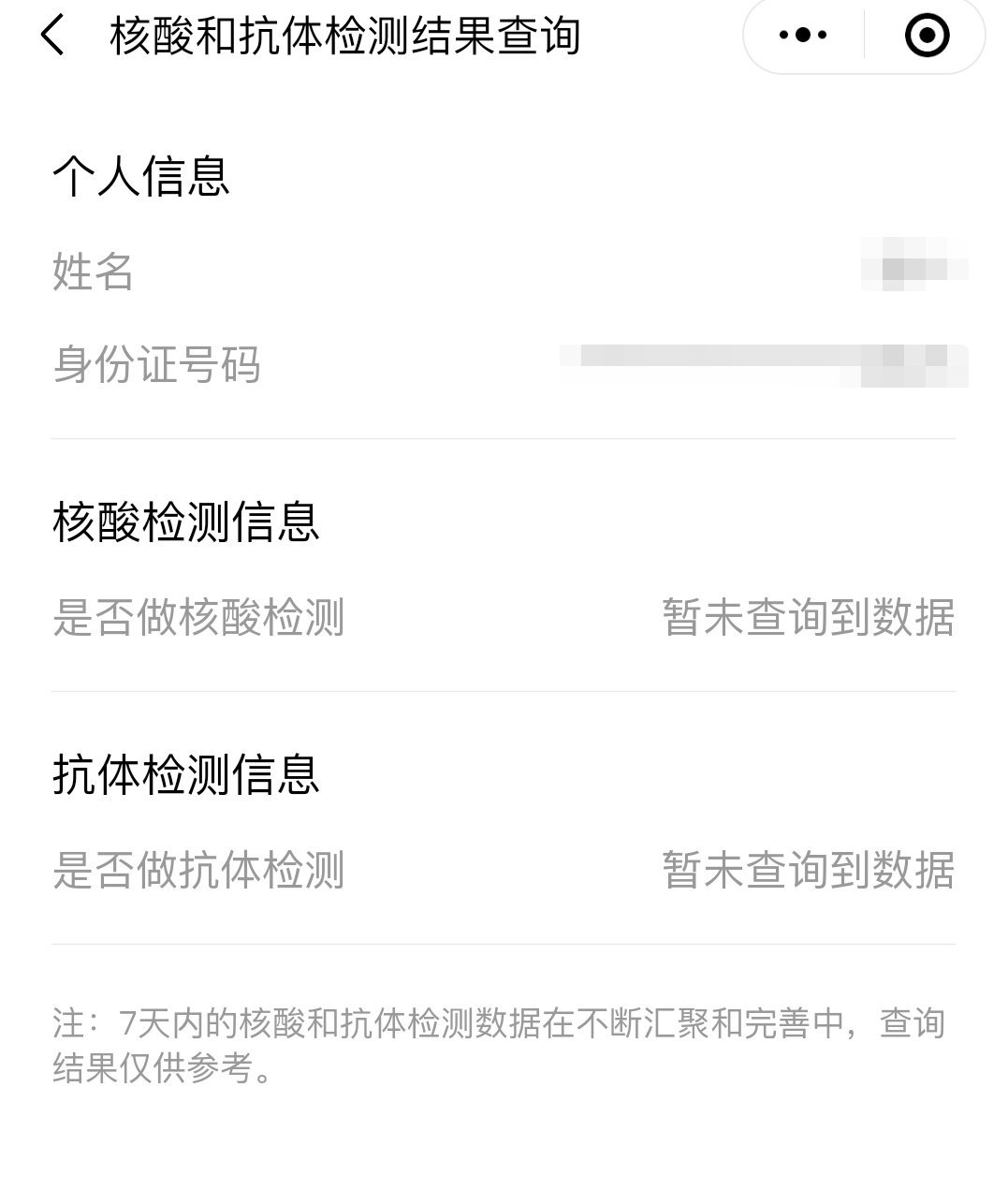 3.在查詢頁面輸入個(gè)人姓名和身份證號(hào)碼后,點(diǎn)擊下方的“查自己”即可查詢到個(gè)人相關(guān)的核酸檢測結(jié)果,如下圖所示。