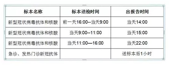 新冠檢查取單時間見下圖,取單地點:門診大廳或各樓層自助取單機。